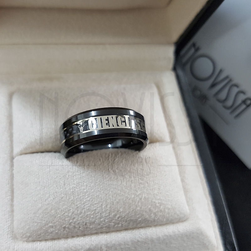 Luxuoso anel de Ciencias Contabeis em Tungstênio com letras folheadas a ouro 18k e um lindo inlay de fibra com acabamento em resina, modelo com tecnologia *Perfect fit* para sensação absoluta de qualidade, conforto e luxo ao usar.