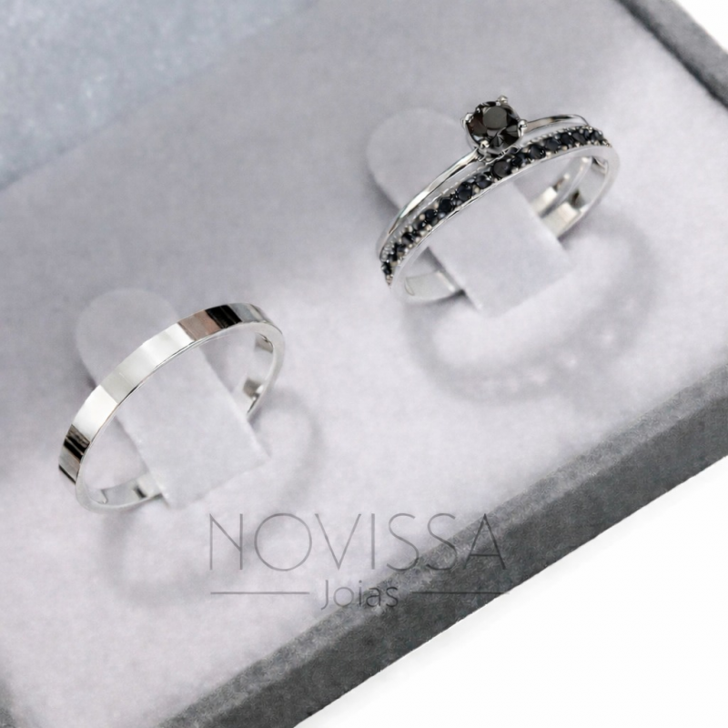 BLACK - PAR DE ALIANÇAS + ANEL SOLITARIO EM PRATA950 COM LINDO CRISTAL DE SWAROVSKI