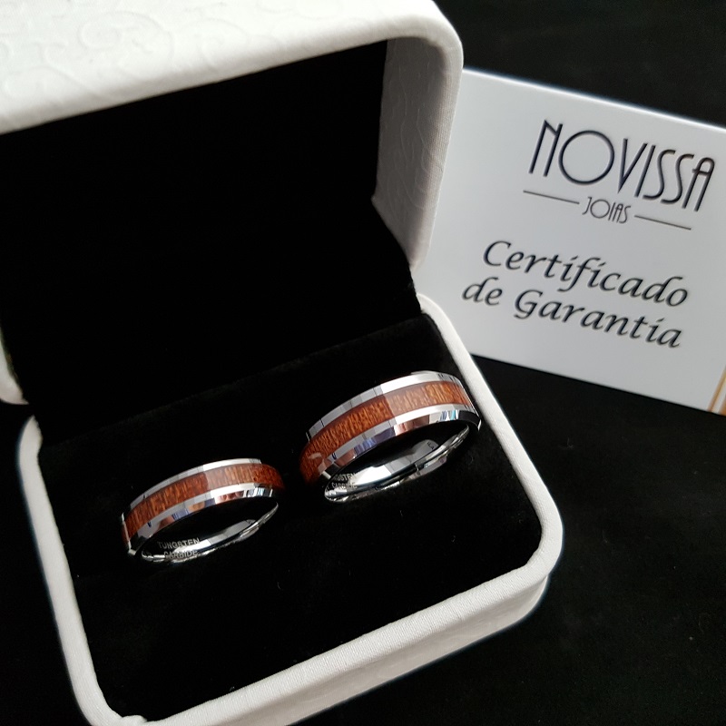 Luxuoso design de Tungstênio com inlay de kona koa wood (Madeira embutida) e acabamento em resina.