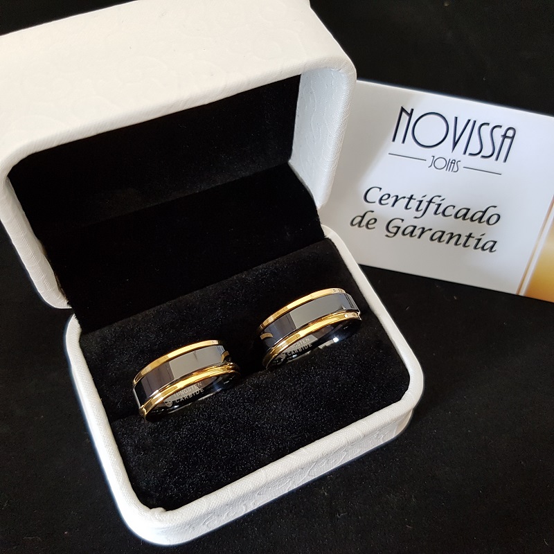 Anel *Gold Edge Edition Smooth*de Tungstênio magnetizado com Titânio para obter a cor pretra, acabamento de alto brilho,