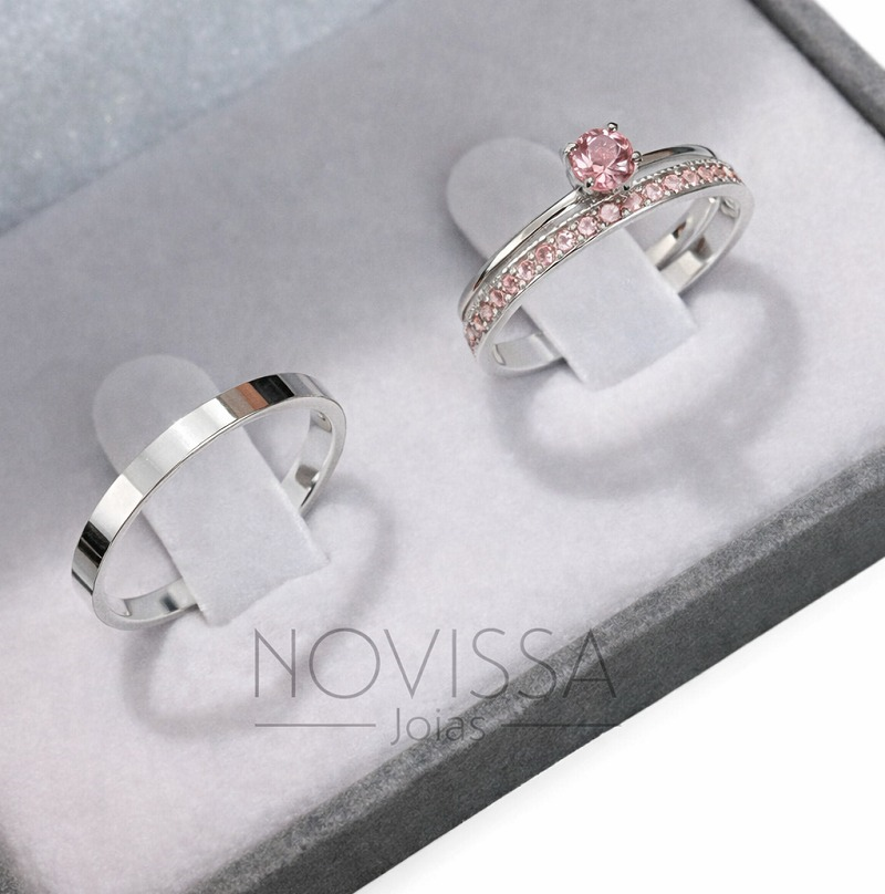 OUR LOVE - PAR DE ALIANÇAS + ANEL SOLITARIO EM PRATA950 COM LINDO CRISTAL DE SWAROVSKI
